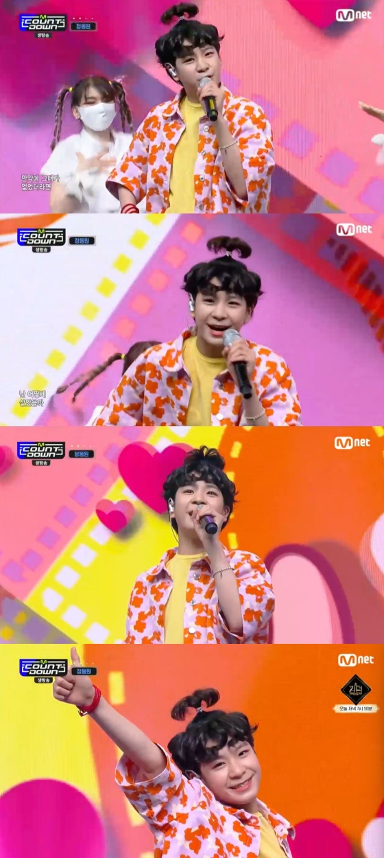 20일 오후 방송된 Mnet 음악 프로그램 '엠 카운트다운'에는 정동원 신곡 '내 마음속 최고' 무대가 그려졌다.