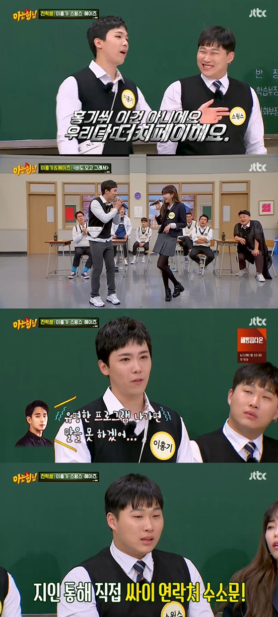 22일 방송된 JTBC 예능 프로그램 '아는 형님'에는 '전역돌'로 돌아 온 가수 이홍기, 최근 싸이의 소속사 피네이션과 한솥밥을 먹게 된 래퍼 스윙스, 새 앨범으로 컴백한 헤이즈가 전학생으로 찾아왔다.