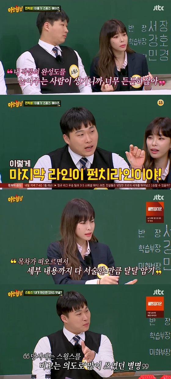 스윙스 '돈가스'라는 별명과 관련 달라진 마음 가짐을 고백했다. 그는 "예전엔 '돈가스' 관련 댓글을 보면 마음이 너무 아팠다. 지금은 유쾌하게 받아들이지만 예전엔 굉장히 예민하게 받아들였다"고 털어놨다. 이어 "지금은 돈가스로 이모티콘도 만들어 팔아서 1위 했다"고 말해 웃음을 자아냈다.