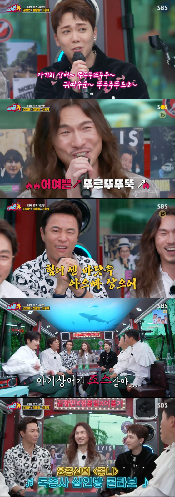 이홍기는 록 발라드 스타일로 포근하지만 힘 있는 아기 상어를, 정홍일은 정통 헤비메탈 창법으로 뿔난 엄마 상어를, 김정민은 '김정민 창법'으로 아빠 상어를 외쳐 현장을 초토화시켰다. 이에 음문석은 "이렇게 화난 아기 상어는 처음이다"며 폭소했고, 탁재훈은 "아기 상어가 죠스 같다"며 웃음을 더했다. 세 사람은 이후로도 개인곡에 이어 함께 '좋니'로 합을 맞추며 가창력을 맘껏 뽐내 감탄을 안겼다.