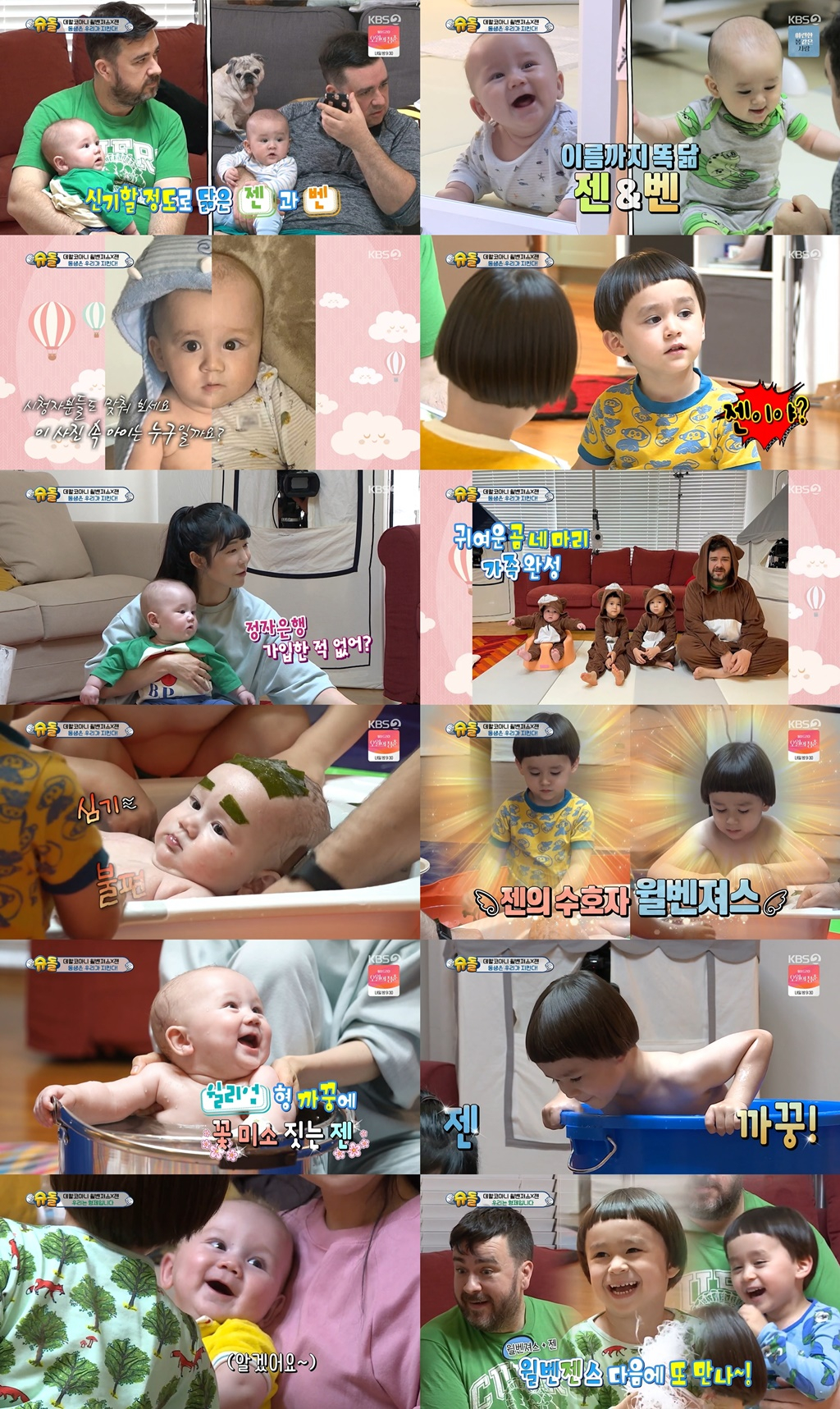 30일 방송된 KBS 2TV '슈퍼맨이 돌아왔다'(이하 '슈돌') 384회는 '지금 나와 어디든 가자'라는 부제로 꾸며졌다. 그중 윌벤져스와 젠의 만남이 성사되며 랜선 이모-삼촌들의 폭발적인 반응을 이끌어냈다.