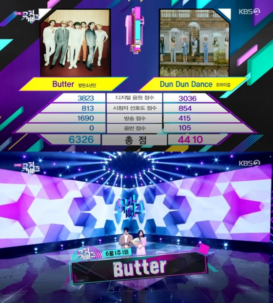 4일 방송된 KBS 2TV '뮤직뱅크'에서는 방탄소년단의 'Butter(버터)'가 오마이걸의 'DUN DUN DANCE(던 던 댄스)'를 누르고 1위를 차지했다.