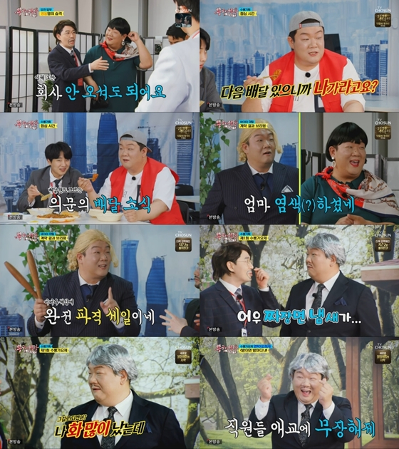 지난 9일 방송된 TV조선 '뽕숭아학당: 인생학교'(이하 '뽕숭아학당')에서 유민상은 임영웅, 영탁, 이찬원, 장민호, 김희재, 황윤성이 구성한 오피스 상황극 '수뽕기획'에 1인4역의 다양한 캐릭터로 재미를 더했다.