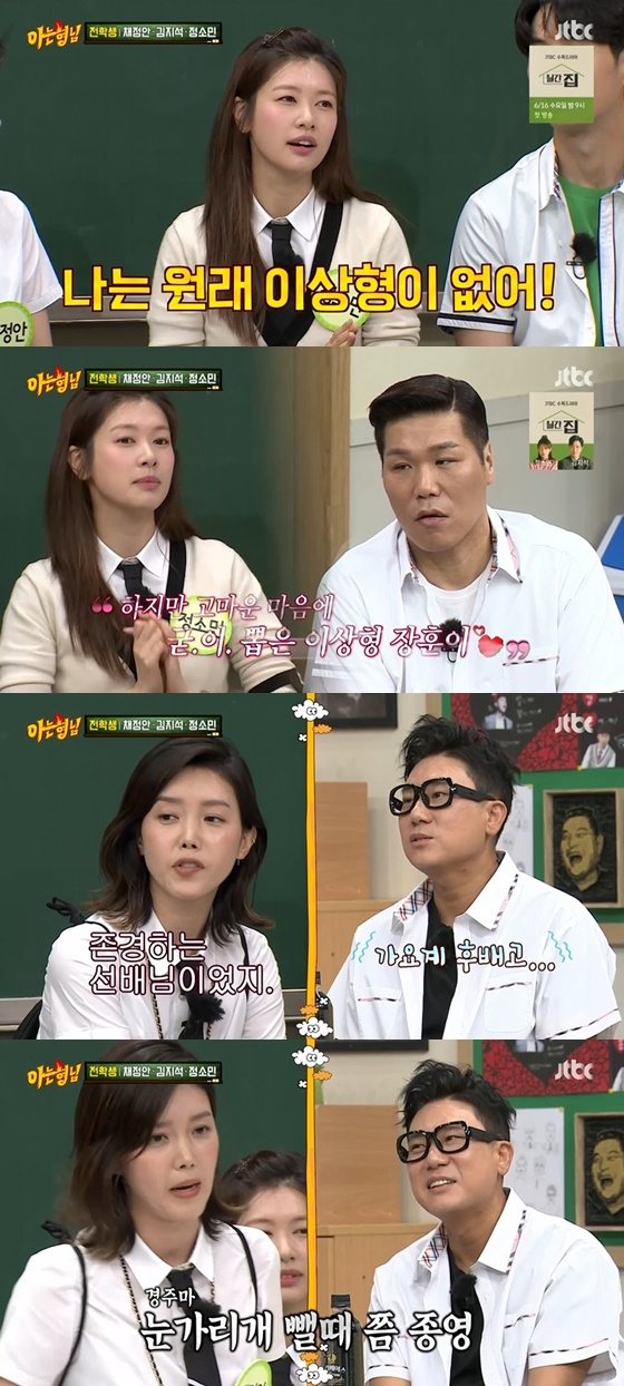정소민은 '아는 형님' 출연 당시 이상형으로 김영철을 꼽았다. 그러나 정소민은 이상형이 바뀌었다고. 정소민은 "저번에 촬영했을 때 이상형이 바뀌었다. 저번에 출연했을 때 녹화 시간이 길었다. 난 에너지가 금방 방전된다. 그때 (서)장훈이가 와서 '많이 힘들죠. 이제 다 끝났어요'라고 말했다. 충전이 되는 기분이더라"라고 설명했다.