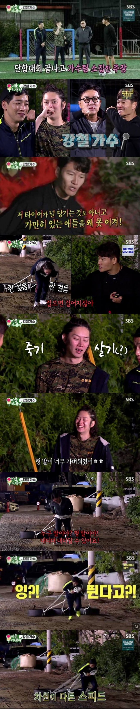 김종국은 하체 힘을 키우는 타이어 훈련에 돌입했다. 20kg짜리 타이어 세 개를 한꺼번에 끌게 했는데, 김희철이 발걸음을 제대로 내딛지 못하자 김종국은 "저 타이어가 널 당기는 것도 아니고, 가만히 있는 애들을 못 이겨"라며 강철 조교의 기운을 내뿜었다. 이에 김희철은 "나도 가고 싶어, 이 녀석아"라며 마음의 소리를 외쳐 웃음을 더했다.