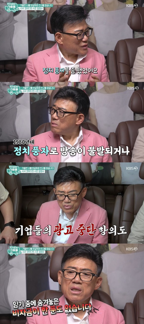 MC 김원희는 "엄영수 선생님이 시사개그, 풍자의 원조 격이 아니냐"고 묻자 엄영수는 "정치 풍자를 했었다. 그래서 방송에 못 나가고 테이프가 통채로 없어지고 그랬다. 기업들에서도 광고를 끊겠다고 난리쳤다"며 에피소드를 전했다.