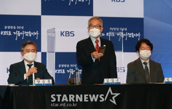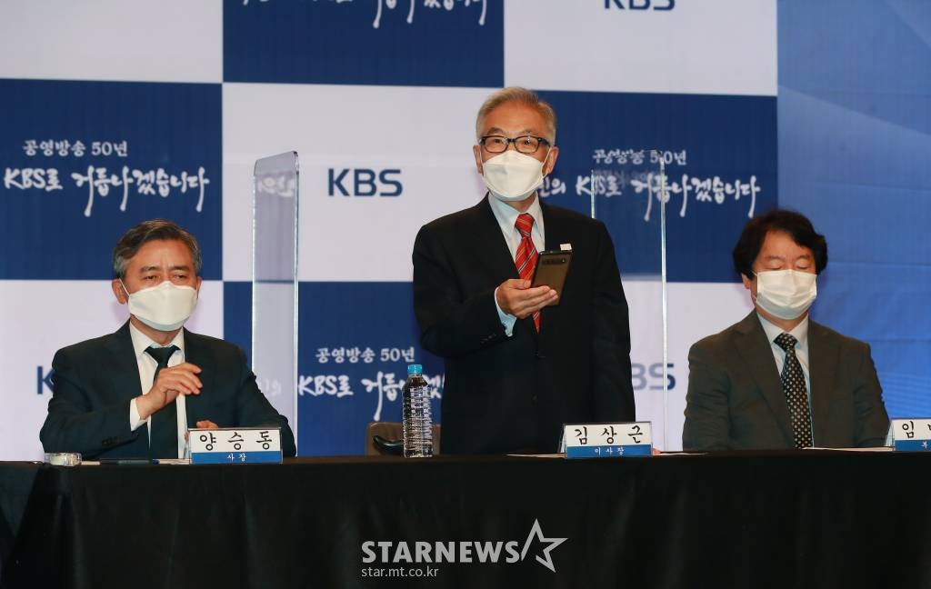 1일 오후 서울 영등포구 여의도동 KBS별관 공개홀에서 수신료 조정안 의결 관련 기자회견이 열렸다. 이날 기자회견에는 양승동 KBS 사장, 김상근 KBS 이사회 이사장, 임병걸 KBS 부사장이 참석했다. KBS 텔레비전방송수신료 조정안 설명회도 함께 진행됐다.