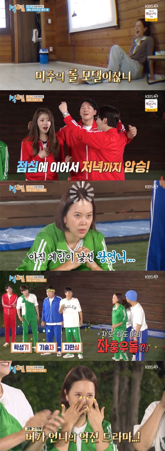 처음부터 모든 게임에 패해 꼴찌가 된 슈퍼목청팀의 백지영은 한참 전부터 당이 떨어진다며 괴로워하더니 팀원 김선호와 김종민을 타박해 웃음을 자아냈다. 백지영은 김선호에 "너는 첫 인상이랑 왜 이렇게 다르냐. 나는 얘가 나 밥 먹여줄 줄 알았다"고 말하고는 이에 동조하는 김종민에 "너는 뭐"라고 분노를 표해 폭소를 안겼다. 백지영은 이후 꼴찌팀에게 주어진 과자 한 상을 먹으며 그나마 조용해진 모습으로 웃음을 더하기도 했다.