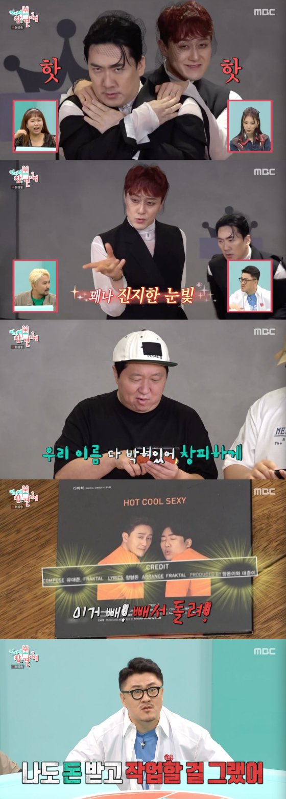 정형돈은 "우리 이름 다 박혀 있다. 창피하게. 이거 빼. 빼서 돌려라"며 진심 어린 말투로 웃음을 자아냈다. 정형돈은 이어 "우리 프로필에는 너희 없다. 왜 돈 쓰냐 자꾸"라며 다비쳐를 타박해 웃음을 더했다. 데프콘은 "방송국에 얘기를 많이 하고 다니더만 우리가 키웠다고. 얘기 안 하는 게 조건이었는데 왜 했냐"고 덧붙여 폭소를 안겼다.