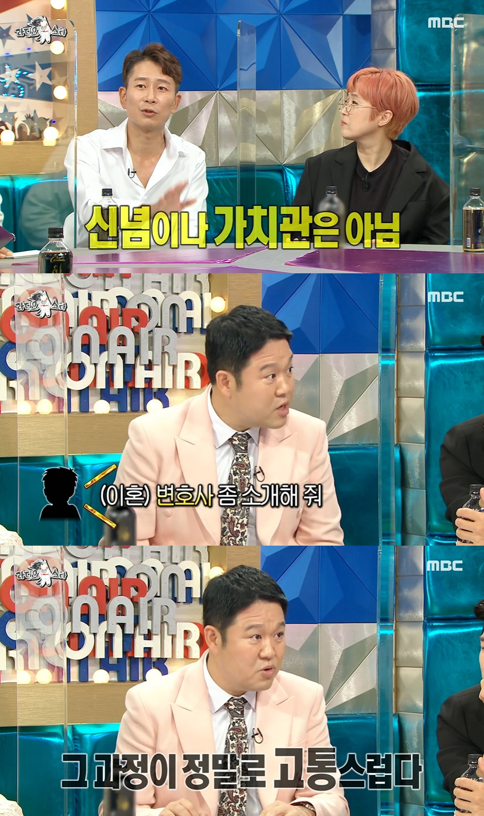 이에 김구라는 "나도 본의아니게 이런 얘기를 많이 물어본다. 그리고 '변호사 소개 시켜달라'고 하더라. 내가 항상 말하는 게 이혼하는 과정이 정말 고통스럽다. 이걸 감당해야 이혼할 수 있다"라고 답했다.