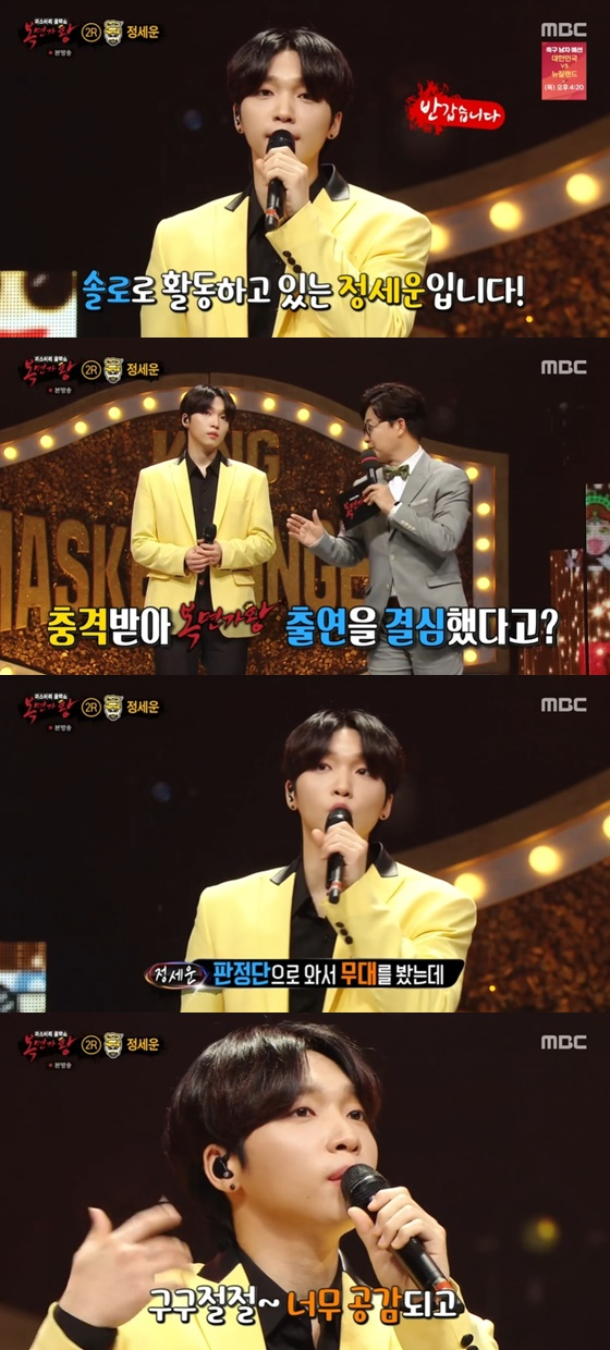 정세운은 기프트 멤버 이주혁이 가왕에 오른 모습을 보고 '복면가왕' 출연을 결심했다고. 그는 "판정단으로 와서 무대를 봤다. 경연용 음악이 따로 있다는 생각을 깨준 게 바코드님이었다. 다시 나와보고 싶었다"라고 설명했다.