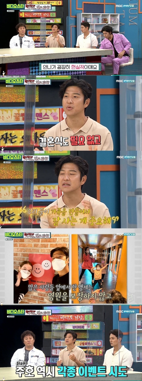 박주호는 "안나가 굉장히 현실적이에요. 결혼식도 필요 없고. 왜냐하면 너랑 나랑 둘이 가족을 만들어서 잘 살면 그게 최고라는 생각을 가지고 있어요. 결혼해봤자 이혼하면 아무것도 아니고 프러포즈해도 이혼하면 아무것도 아니기 때문에 끝까지 잘 사는 게 중요하다고 하더라"라고 말했다.