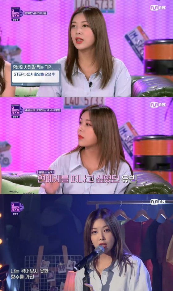 이날 방송에서 슬럼프가 왔던 시절을 떠올린 유빈은 "연예계를 떠나고 싶었다"고 솔직하게 고백했다. 이어 "그러던 중 친구 작업실에서 들린 음악이 너무 좋았다. 그 순간 난 음악은 그만두지 못할 것 같다고 생각했다. 그 이후로 더 연습에 매진했다"고 해 슬럼프도 이겨낸 남다른 음악 사랑을 전했다.