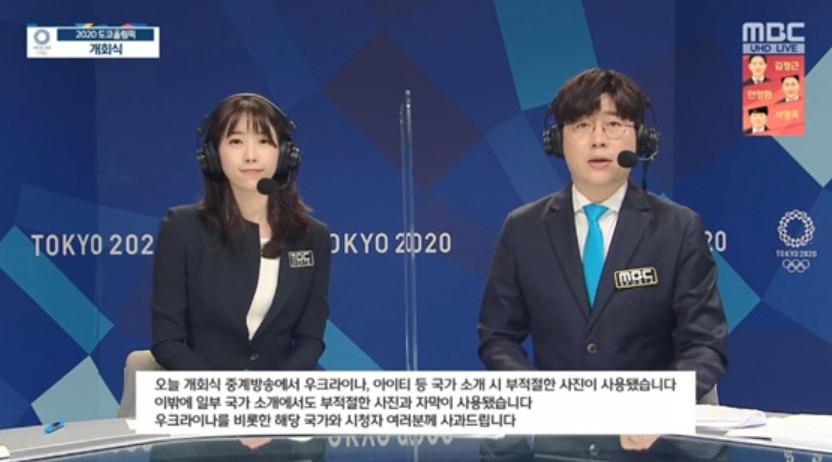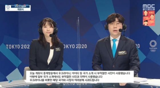 MBC는 지난 23일 2020 도쿄올림픽 개막식 중계 방송 도중 부적절한 문구를 사용했다. 우크라이나 선수단 입장 당시 체르노빌 원자력 발전소 사진 사용, 마셜 제도는 "한때 미국의 핵 실험장"이라고 말했다. 또한 동티모르 선수단엔 '2002년 인도네시아로부터 독립" 등 각국 소개를 정치적 이슈로 표시한 것.