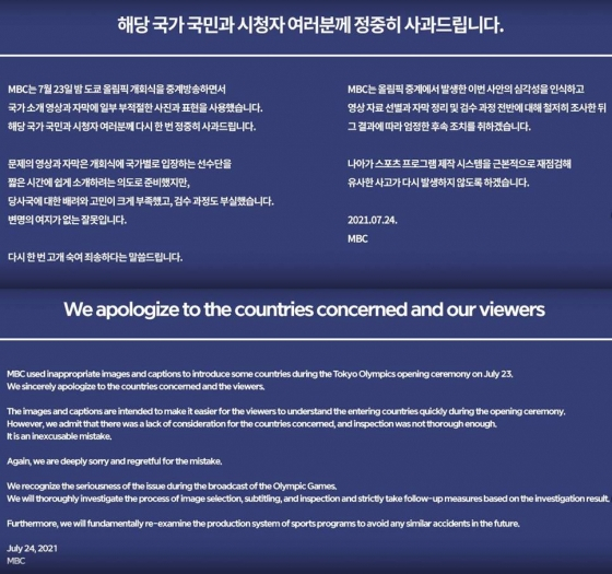 한편 MBC는 지난 24일 한글과 영어 두 차례의 사과문을 통해 "해당 국가 국민과 시청자 여러분께 정중히 사과드린다"며 "문제의 영상과 자막은 개회식에 국가별로 입장하는 선수단을 짧은 시간에 쉽게 소개하려는 의도로 준비했지만, 당사국에 대한 배려와 고민이 크게 부족했고, 검수 과정도 부실했다. 변명의 여지가 없는 잘못"이라고 사과했다.