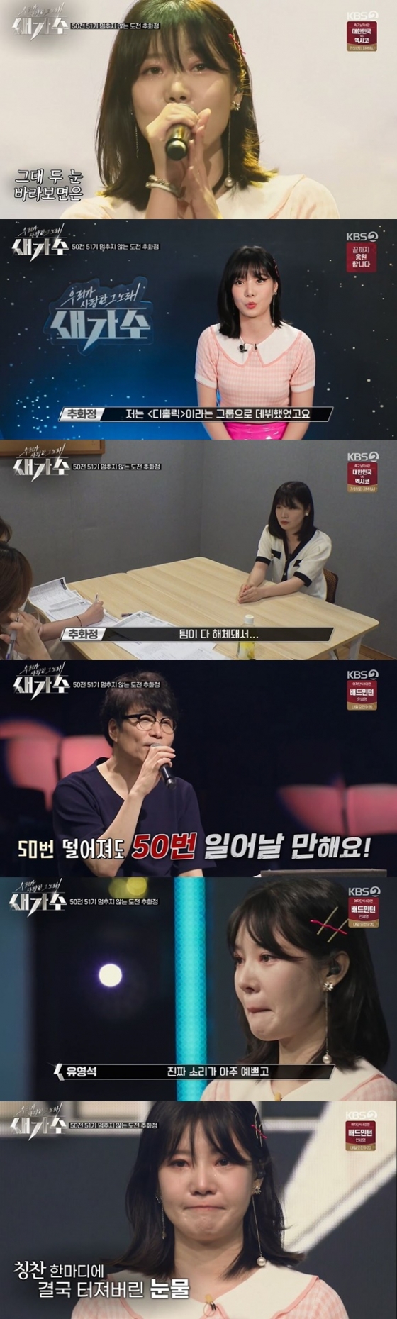 추화정의 노래를 들은 유영석이 "오십 번 떨어져도 오십 번 일어날만해요. 너무 소리가 예쁘고 오늘 노래 되게 좋았어요"라며 칭찬하자 추화정은 참았던 눈물을 쏟아냈다.