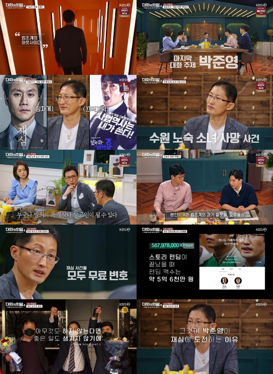 그런가 하면, 박준영 변호사는 무료 변호를 하다 파산을 하고, 그를 도우려는 사람들의 스토리 펀딩으로 5억 6천만 원을 모은 과거도 이야기했다. 그는 이에 대해 "세상이 더 좋아졌으면 하는 사람들의 마음, 의미 있는 일에 동참하고 싶은 마음이 있었던 것 같다"고 말했다. 이러한 마음들이 모여 박준영 변호사는 계속해 재심 사건을 할 수 있었다고. 지금도 경제적 상황이 좋지 않지만, 여전히 약자들을 위해 진실을 좇고 있는 그의 행보는 묵직한 울림을 남겼다.