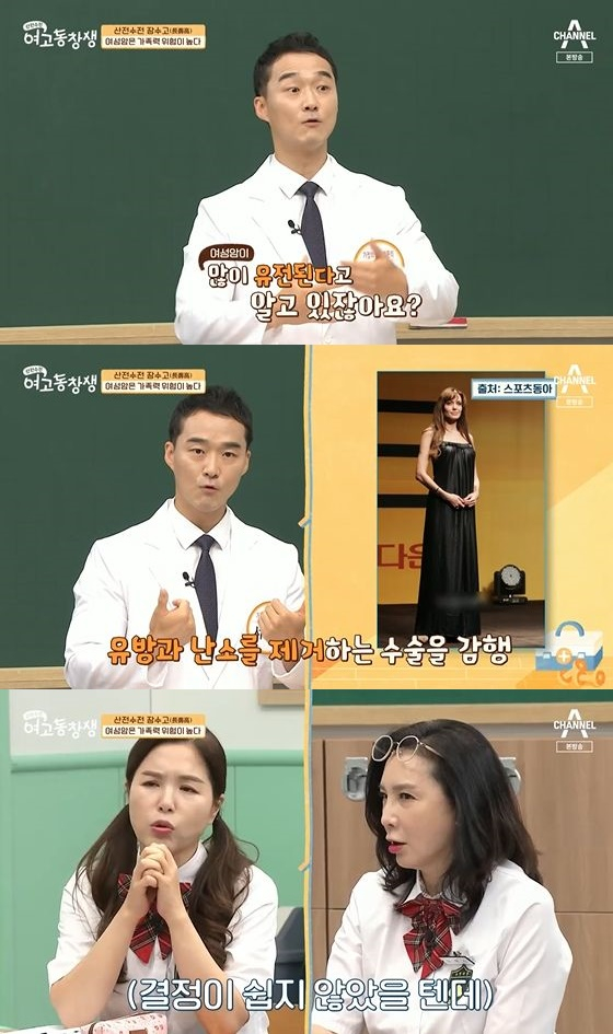 안젤리나 졸리는 변이된 유전자를 갖고 있어 예방 차원으로 유방과 난소를 제거하는 수술을 받았다. 전문의는 "변이된 유전자를 가진 여성의 경우 40% 유전된다"고 덧붙였다. 이에 여고동창생 멤버들은 "유방과 난소까지 절제한 것인가. 그런 결정 쉽지 않았을 텐데"라며 놀라워했다.