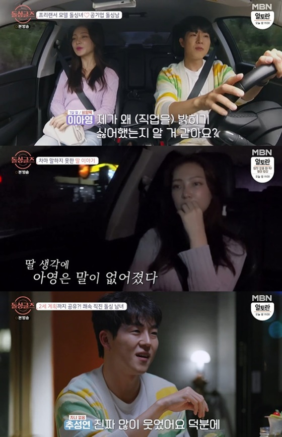 추성연은 전 남편이 딸을 양육 중인 이아영에게 "딸이 보고 싶진 않냐"고 조심스럽게 물었다. 이아영은 "보고싶다"고 답하고 침묵을 이어가더니 "아직도 모르겠다. 이게 맞는 건지. 힘들었지만 이제 받아들이기로 했다"고 힘겹게 말했다. 솔직한 대화 속에도 설레는 분위기를 이어가던 두 사람을 보며 MC들은 "이 커플 분위기가 좋다"고 말했다.