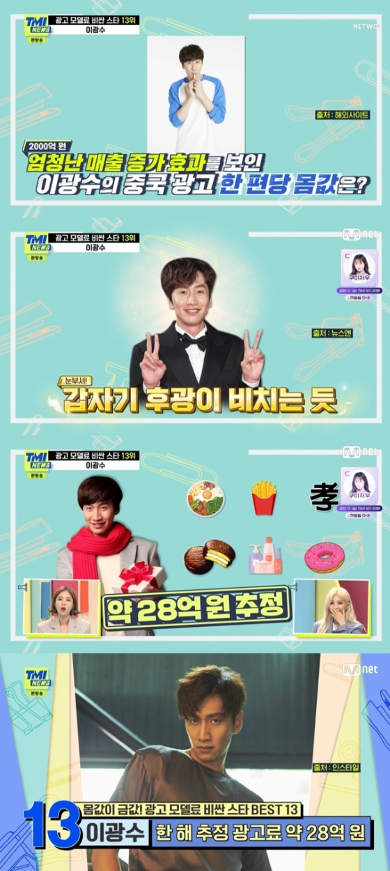 이광수는 4일 오후 방송된 Mnet 예능 프로그램 'TMI 뉴스'에서 광고 모델료 비싼 스타 13위로 꼽혔다.