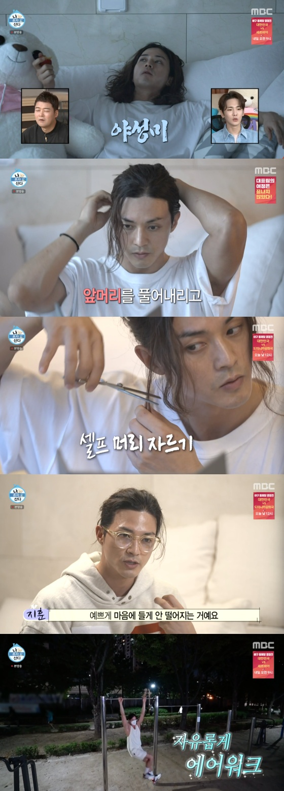 배우 김지훈이 '나 혼자 산다'에서 야성미 넘치는 모습으로 셀프 헤어컷에 나섰다.