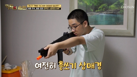 엄마를 도와 마늘까기를 끝낸 아들은 자신의 방에서 총쏘기 연습을 시작했다. 아들은 사과와 지우개를 놓고 BB탄 총을 쏘고 있었다.