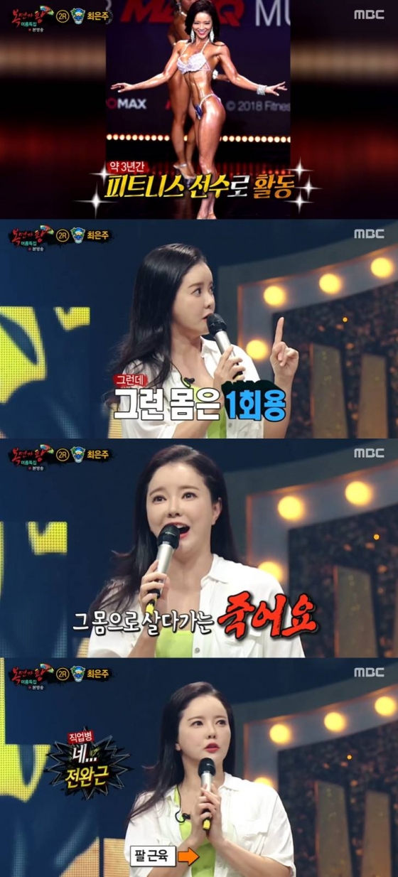 최은주는 피트니스에 대한 자신의 이미지를 깨고 싶다며 "양치승 관장님을 만나면서 대회를 3년 동안 나갔다. 많은 분들이 아직도 그 몸이 있는 줄 아는데, 그런 몸은 1회용이다. 대회 날 하루만 있는 몸이다. 그렇게만 살면 죽는다"며 "건강한 이미지의 배우로서 모습을 보여드리고 싶다"고 말했다.