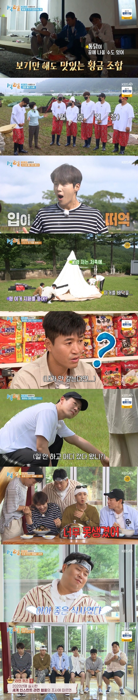 이렇듯 '1박 2일'은 국민 먹거리의 향연으로 입맛을 돋우는가 하면, 여섯 남자의 대결에 정점을 찍을 최강 라면의 등장을 예고하며 이어질 방송에 대한 시청자들의 궁금증을 더욱 고조시켰다.