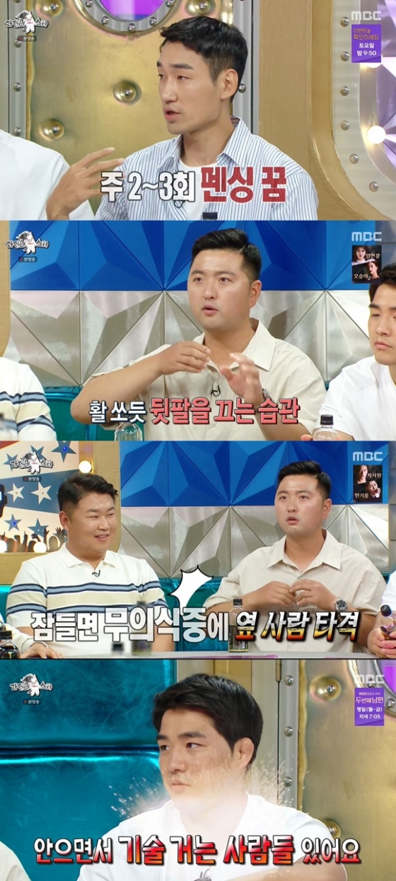 양궁 김우진 선수는 "양궁 같은 경우는 활을 쏠 때 뒤 팔을 끌어요. 외국 시합을 다닐 때 잠들면 무의식 중에 옆 사람을 툭툭 친다"며 털어놨다.