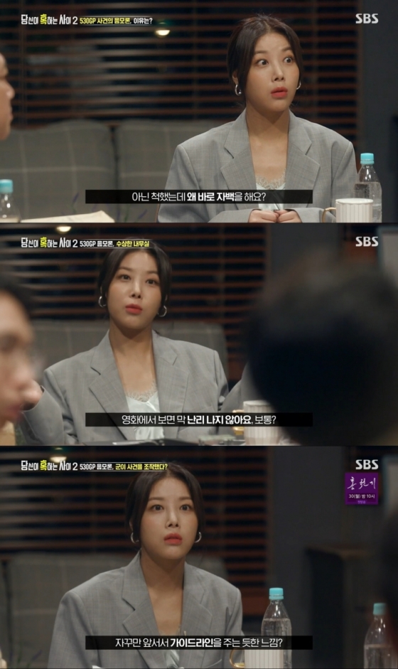 음모론에 대해 이야기를 나누기 전 사건의 전말을 듣던 유빈은 "범인이 아닌 척했으면서 왜 자백을 하냐?"며 의문을 제기했다.