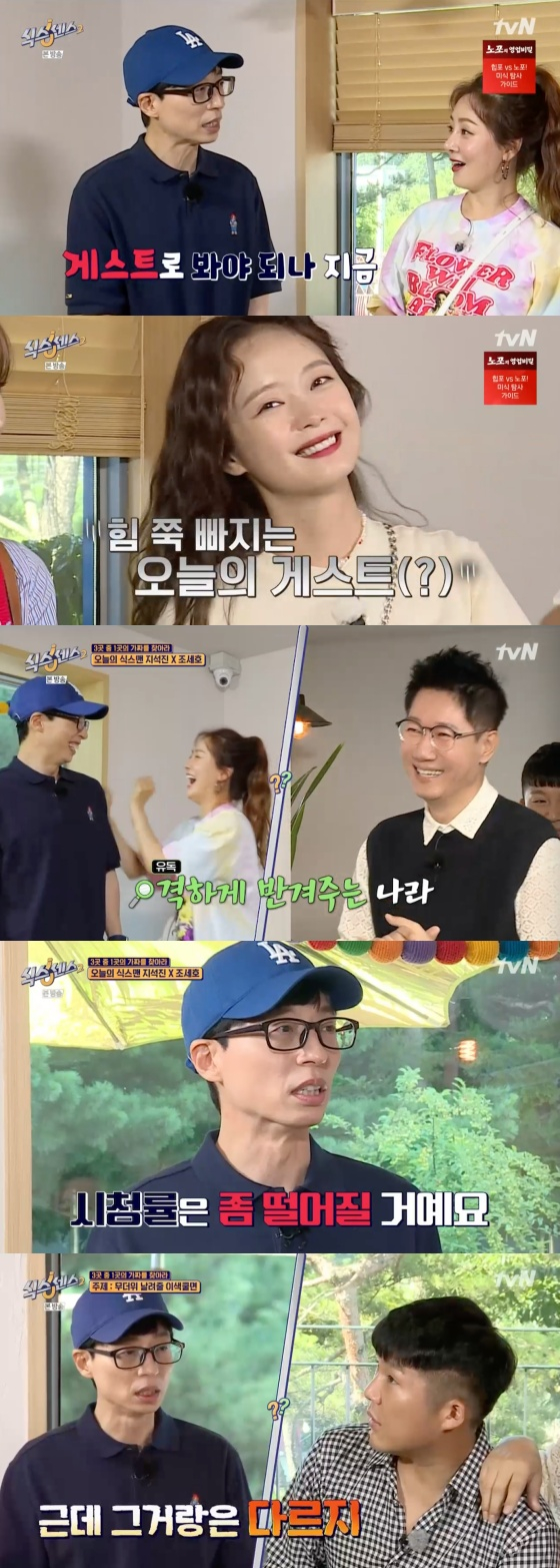 20일 오후 방송된 tvN 예능 프로그램 '식스센스2'에는 유재석의 '찐친' 지석진, 조세호가 게스트로 출연하는 장면이 담겼다.