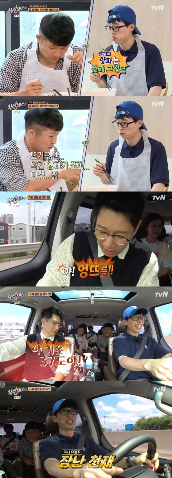 촬영이 시작되자 유재석은 본격적으로 조세호와 지석진을 놀리기 시작했다. 이날 주제는 '가짜 쿨면을 찾아라'였고 첫 번째 식당으로 팥빙콩국수를 파는 식당이 제시됐다. 조세호가 "어른들이 먹는 팥칼국수 먹는 느낌 아니냐"라고 하자 유재석은 "그거랑은 다르다"며 토크를 차단했다.