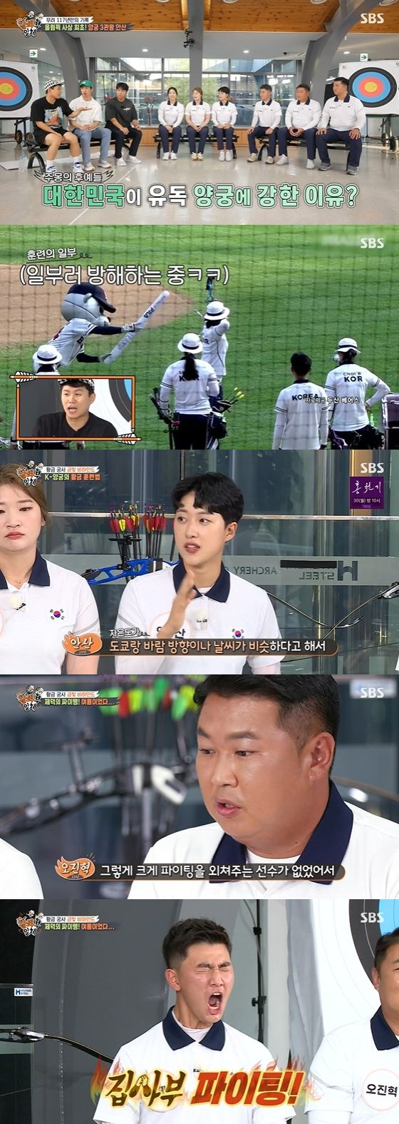 이날 멤버들은 "대한민국이 특히 양궁에 강한 이유가 무엇이라고 생각하는지"에 대해 물었다. 오진혁 선수는 야구장 훈련을 언급했다. 오진혁은 "양궁의 압박감과 가장 비슷한 곳을 찾다보니 야구장이 있었다. 꽉찬 관중의 중압감을 견디며 훈련하기에 적합하다"고 했다.