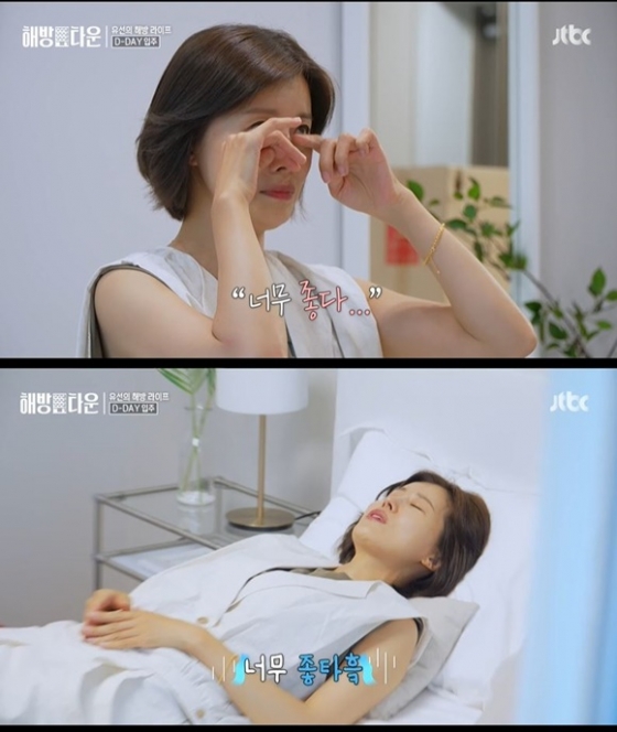 그릇을 정리한 후 침대에 누운 유선은 "너무 좋다"며 또 눈물을 흘렸다. 유선은 감동이었지만 이를 지켜보던 MC들은 웃음을 터트렸다.