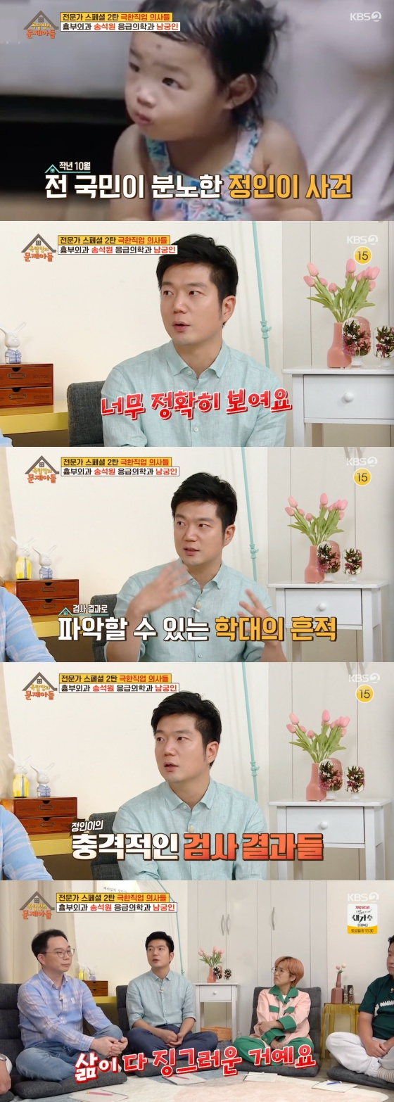 이날 남궁인은 정인이 사건을 진료했을 때를 말하며 "의사가 보기에는 그 과정이 너무 정확하게 보인다. 이 아이가 어떤 과정으로 맞았는지 X-ray와 CT로 설명된다. 뼈가 부서진 곳이 시기별로 다르고 팔도 뽑혀있다. '학대 당해서 죽었구나'가 보인다. 세상에서 존재해야 할 게 있다면 바로 이것(아동학대)이다. 어른들이 아이를 학대해서 왜 이렇게 만들어야 하는가"라고 했다.