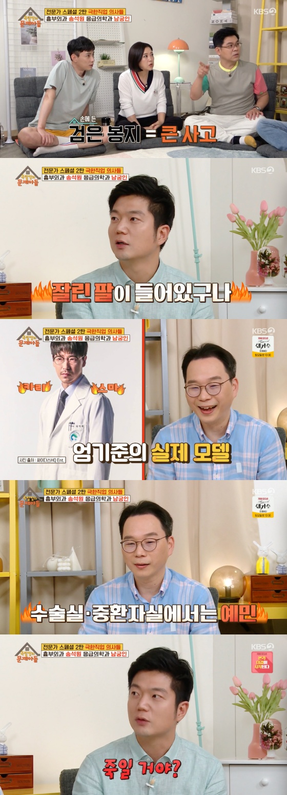 송석원은 SBS 드라마 '흉부외과' 엄기준 역할의 실제 모델임을 밝혔다. 송석원은 "밖에서는 웃고 다니는데 병원에서는 다르다. 수술실과 중환자실에서는 예민하다"고 설명했다. 이에 남궁인은 "이런 분이 병원에서 다르다. 중환자실에서 '죽일거야?' (이렇게 물어본다)"며 덧붙였다.