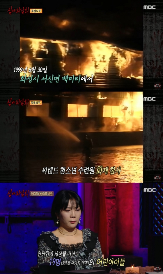 '심야괴담회'는 지난 19일 방송에서 씨랜드 청소년수련원 화재사고를 다뤘다. 이는 1999년 6월 경기도 화성 씨랜드 청소년수련원에서 발생한 화재 사고로, 유치원생 19명을 포함해 23명이 목숨을 잃은 사건이다. 당시 방송에서 출연진들은 "정말 안타까운 사건"이라고 말하며 추모했다.