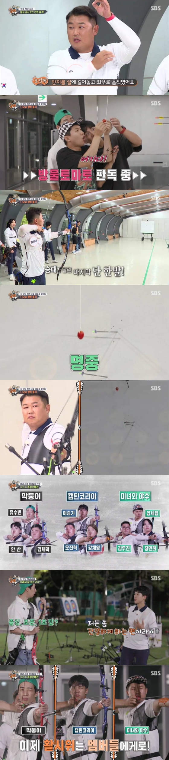 이후 사부와 멤버들은 세 팀으로 나눠 '활쏴부일체' 금배지가 걸린 단체전에 나섰다. 막내 라인 안산, 김제덕, 유수빈은 '막둥이' 팀으로, 오진혁, 강채영, 이승기는 '캡틴 코리아' 팀, 김우진, 장민희, 양세형은 '미녀와 야수' 팀으로 뭉쳤다.