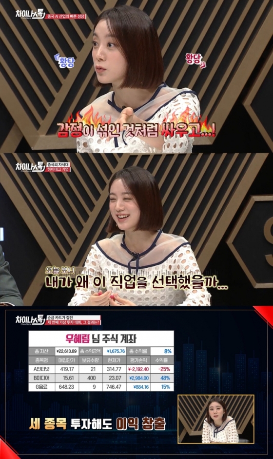 우혜림이 고정 MC로 활약하고 있는 '차이나스톡'은 중국 주식 시장의 흐름을 파악하고 제대로 중국 주식 투자 방법을 배울 수 있는 시사 교양 프로그램이다.