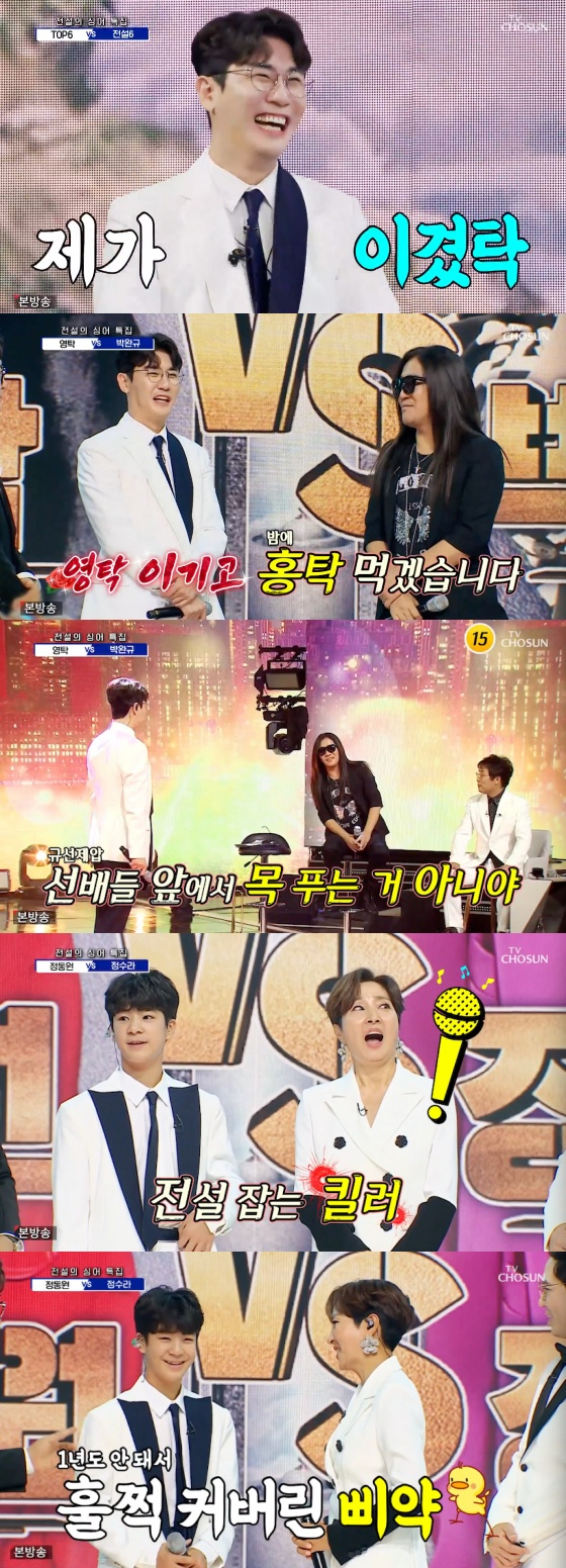이날 첫 대결은 영탁과 박완규였다. 박완규는 지난 번 출연 때도 영탁과 대결했고 패배했었다. 건강검진 후라 공복이라던 박완규는 "영탁 이기고 저녁에 홍탁 먹겠다"며 힘을 냈다. 박완규는 목을 푸는 영탁에게 "선배들 앞에서 목 푸는 거 아니야"라고 견제하기도 했다.