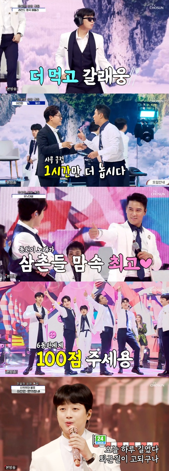 다시 대결이 시작되고 분위기가 진정되는 것 같았던 그때 다시 출연진들은 무대로 뛰쳐나왔다. 영탁과 이용의 '사랑과 행복 그리고 이별'에 흥분한 것. 노래가 끝나고 출연진들이 자리로 돌아갔지만 장민호는 MC 김성주에게 "1시간만 더 놉시다"고 매달렸다.