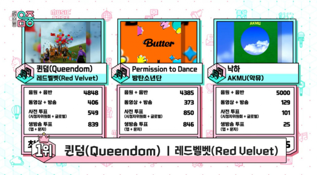 이날 1위 후보로는 레드벨벳의 '퀸덤', 방탄소년단의 'Permission to Dance' 그리고 악동뮤지션의 '낙하'였다.