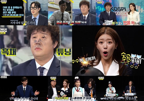 깜짝 등장한 신봉선 역시 증시현황을 뉴스에 투입돼 깜짝 카메라의 새로운 희생양이 됐다. 하하는 뉴스를 끝마친 후 "솔직히 말하면 봉선이 실수해서 좋았다. 위로가 됐다"고 털어놨고, 신봉선 역시 "난 오빠를 보지 않았지만 위로가 된다"고 불타는 동지애를 보였다.