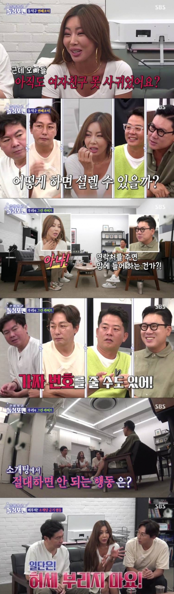 제시의 시원하고 솔직한 조언을 들은 '돌싱포맨'은 두 명씩 나눠 직접 '소개팅' 시뮬레이션에 들어갔다. 하지만 탁재훈은 자신의 상대로 '중매의 여왕' 김인숙 전문가가 등장하자 당황했다. 김인숙 전문가는 "탁재훈 씨 나온다니까 얼른 나왔다"며 자연스럽게 탁재훈 앞에 앉아 웃음을 안겼다. 이들은 막상 소개팅 분위기로 전환되자 말을 더듬는가 하면 메뉴를 주문하는데 서툰 모습을 보였다.