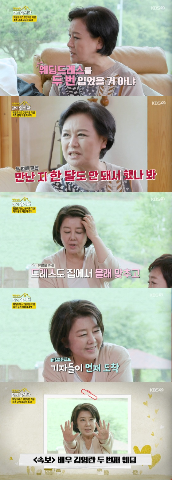 이에 김영란 역시 재혼 당시를 떠올렸다. 김영란은 "처음 드레스는 다 협찬으로 했다. 두 번째는 비밀리에 하겠다고 집에서 따로 맞추고 헤어, 메이크업도 집으로 오라고 해서 나름 보안 유지를 했다. 그런데 결혼식장에 가니까 기자들이 먼저 와있더라. 손으로 취재진을 막았는데 그 사진이 재혼 기사에 나갔다"고 말했다.