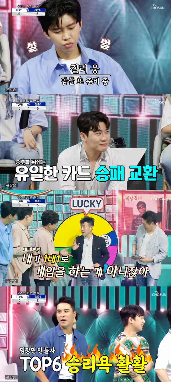 TOP6가 이길 수 있는 방법은 룰렛 돌리기뿐이었다. 박남정은 룰렛판 위치를 보다 '승패 바꾸기'를 가장 좁은 곳에 붙였다. 박남정은 "내가 1대1로 게임하는 게 아니지 않냐. 우리 식솔들이 다 있다"고 설명했다. 장민호는 "역대급으로 좁은 곳에 놨다. 이기고 싶은 생각 없었는데 제발 저기 나와라"라며 분노했다.