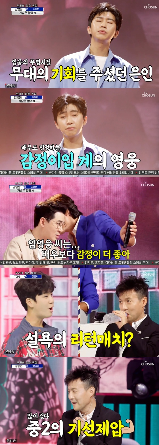 임영웅은 짙은 감성으로 감탄을 자아냈다. 임영웅은 김정현과으 대결에서 나예원의 '가슴은 알죠'를 불렀다. 나예원은 임영웅이 무명일 때 무대 기회를 줬던 은사다. 임영웅에게는 더욱 뜻깊은 무대였던 것.