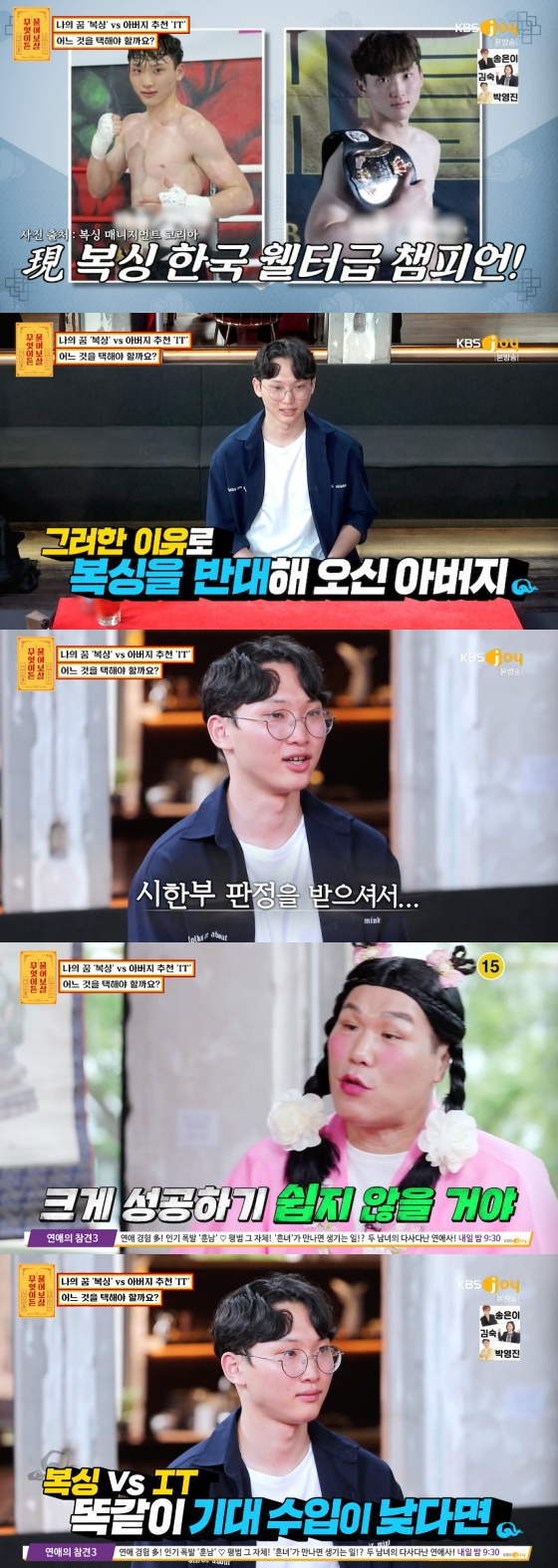 13일 오후 방송된 KBS JOY 예능프로그램 '무엇이든 물어보살'에 아버지 말에 따라 진로를 변경하려는 복싱선수 의뢰인이 나왔다.