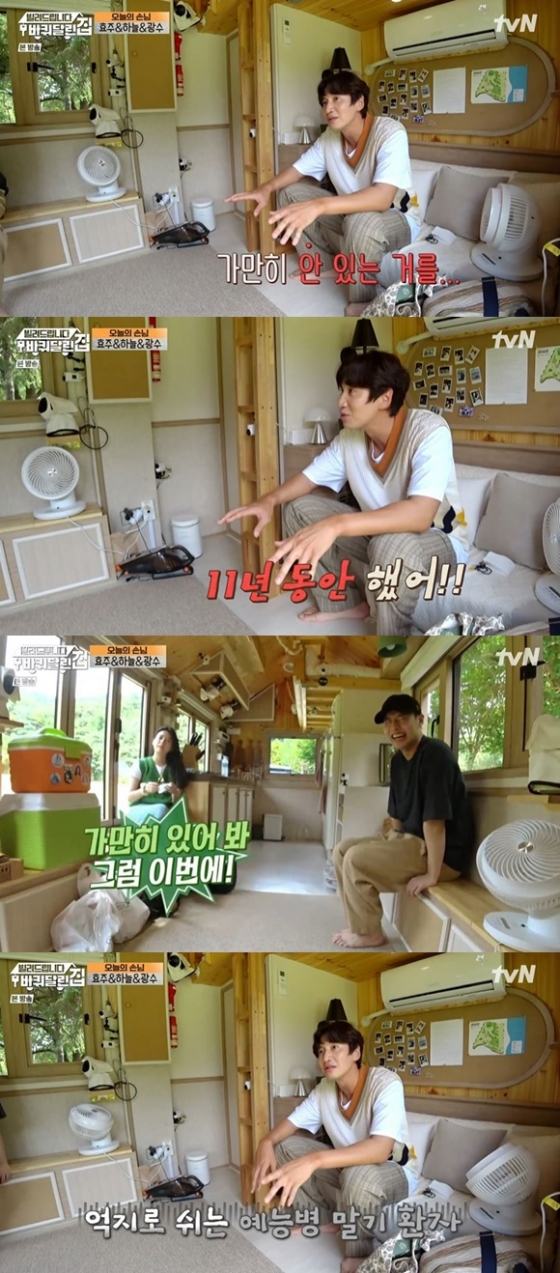 13일 오후 방송된 tvN 예능프로그램 '빌려드립니다 바퀴 달린 집'에서 이광수가 힐링 예능임에도 가만히 있지 못했다.