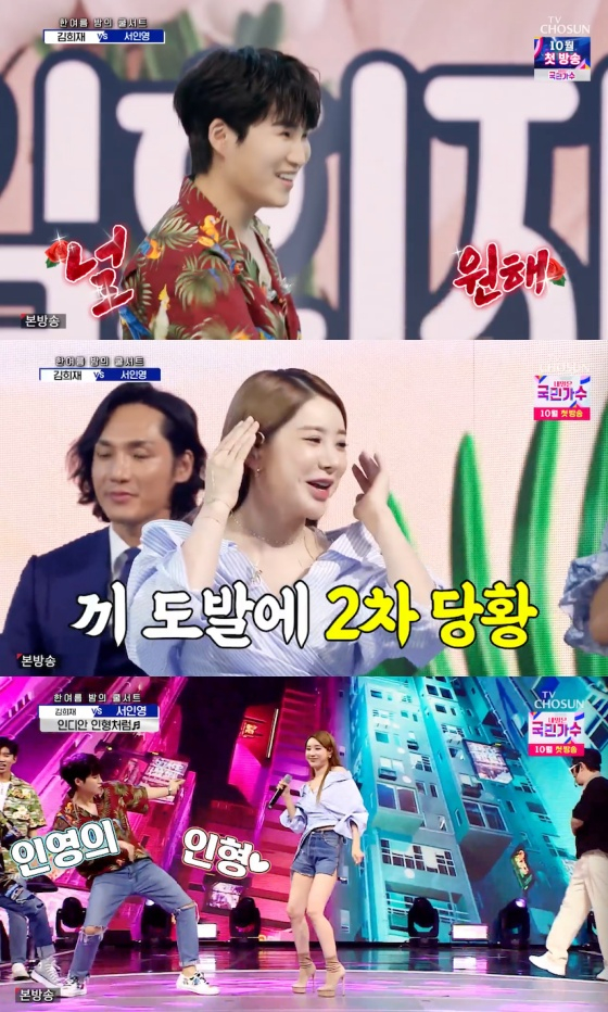 이날 첫 대결로 김희재와 서인영이 지목됐다. 김희재는 서인영의 노래 '너를 원해'를 부르며 서인영에게 손짓했다. 서인영은 "저 분 장난아니다. 눈에 끼가"라며 당황했다.
